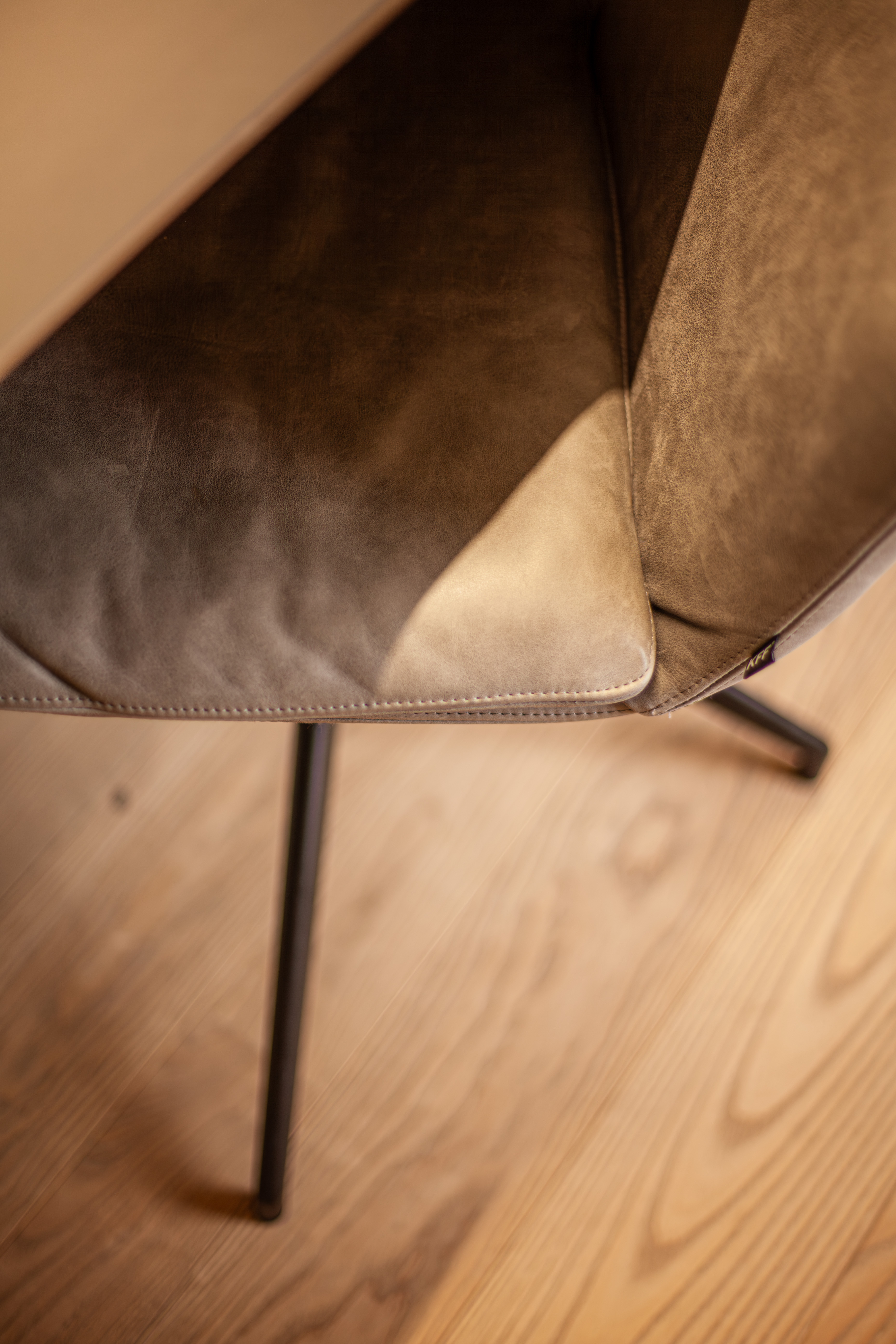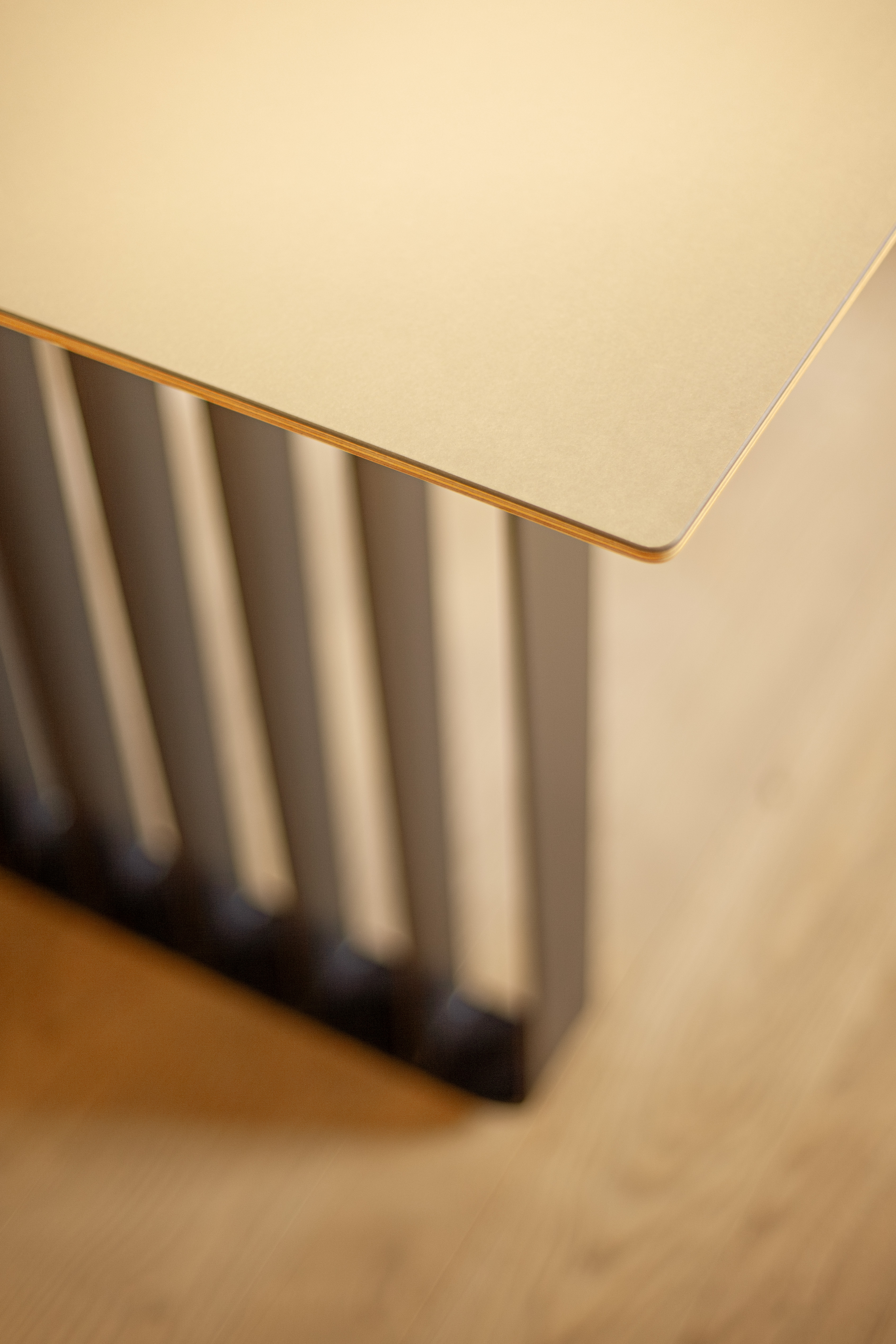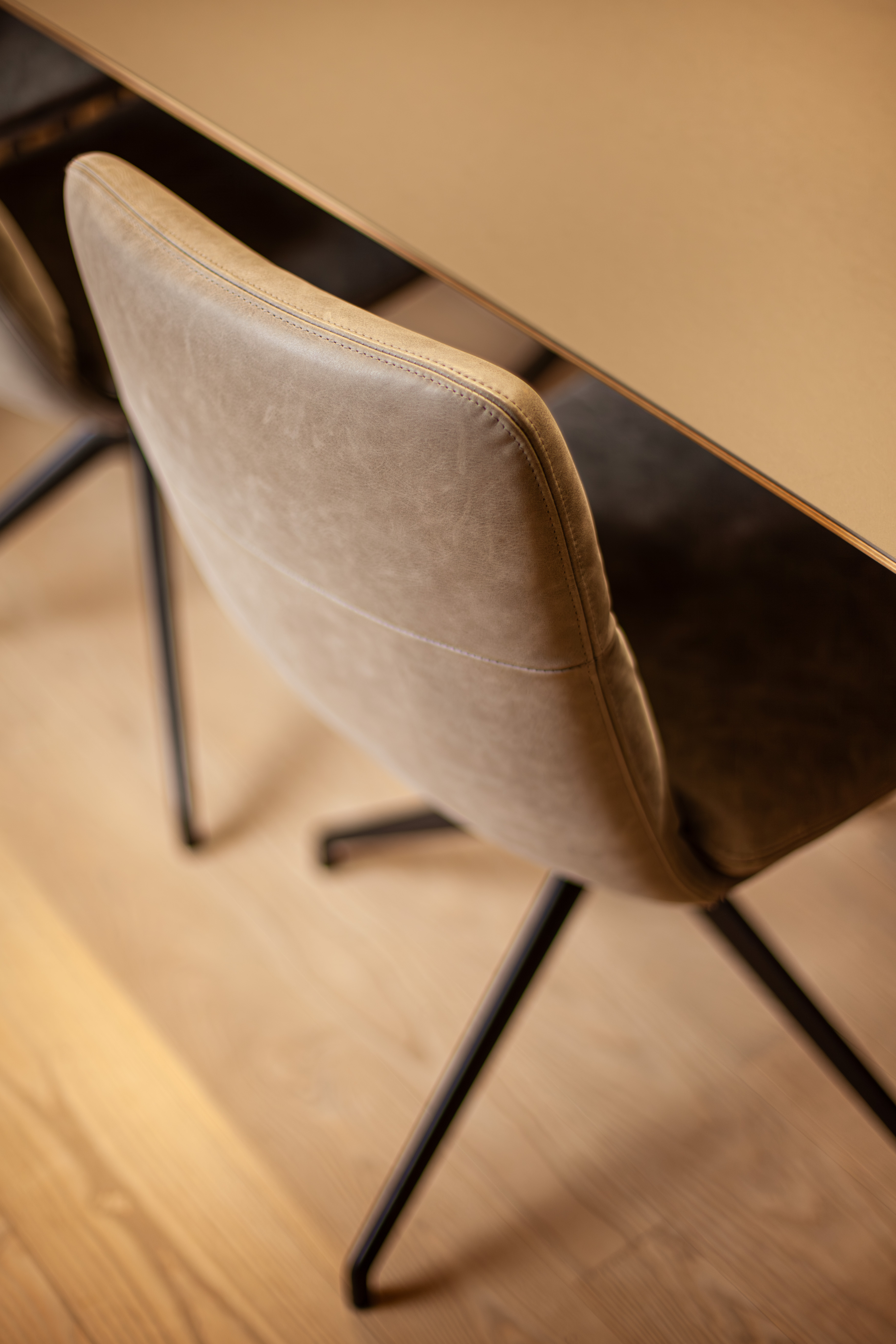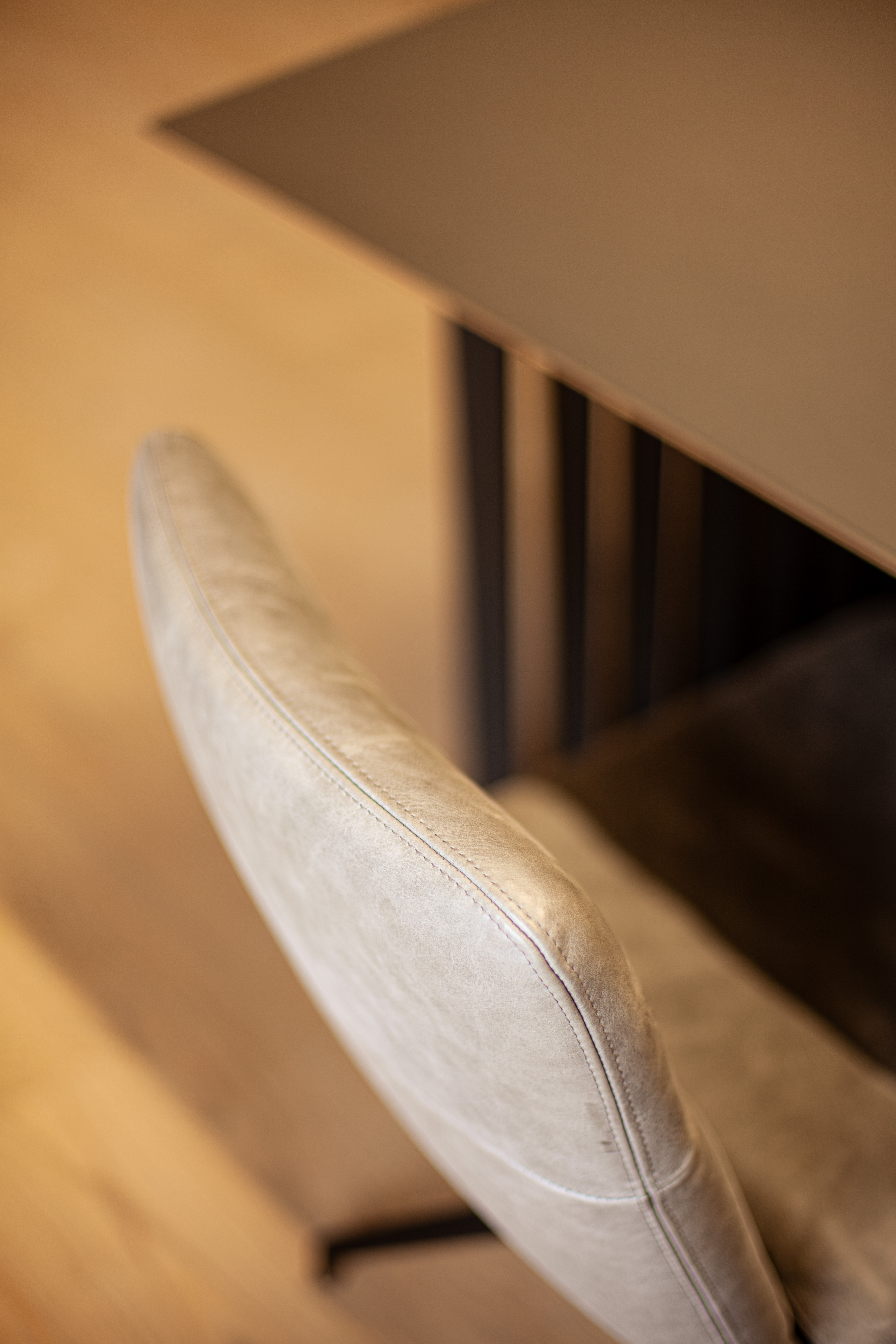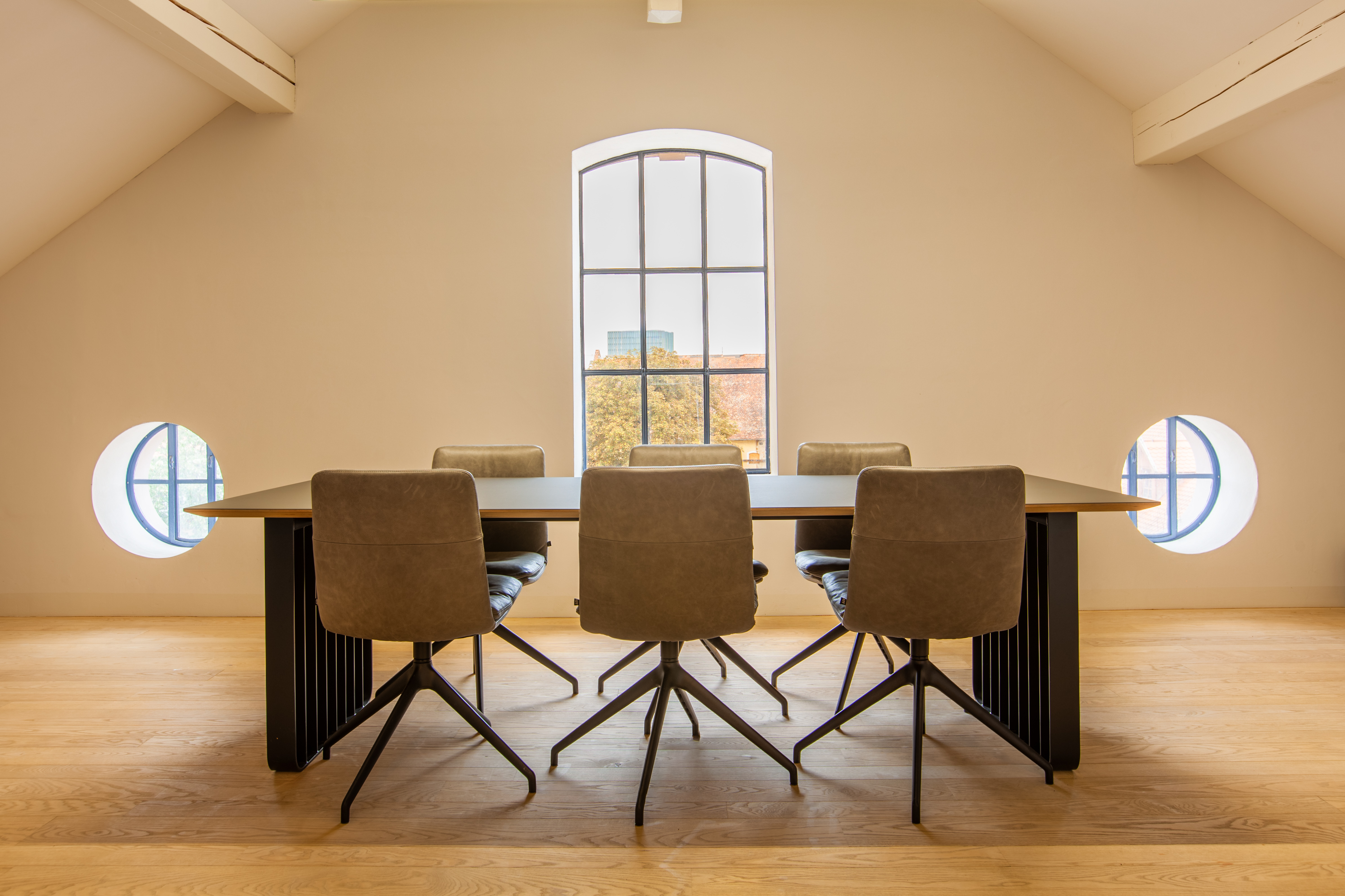 Tisch und Stühle der Teeküche fügen sich harmonisch in den stilvoll schlichten Aufenthaltsraum der Brennerei ein. Zum Einsatz kamen nur hochwertigste Materialien wie etwa Stahl und Echtleder, welche durch Ihre Langlebigkeit im täglichen Gebrauch nichts an Schönheit einbüßen. Das markante, massive Stahlgestell des Tisches nimmt die geradlinige schmale Formen des Bestandsfensters auf und stellt gleichzeitig ein eigenständiges Gestaltungselement im Zentrum des Raumes dar.