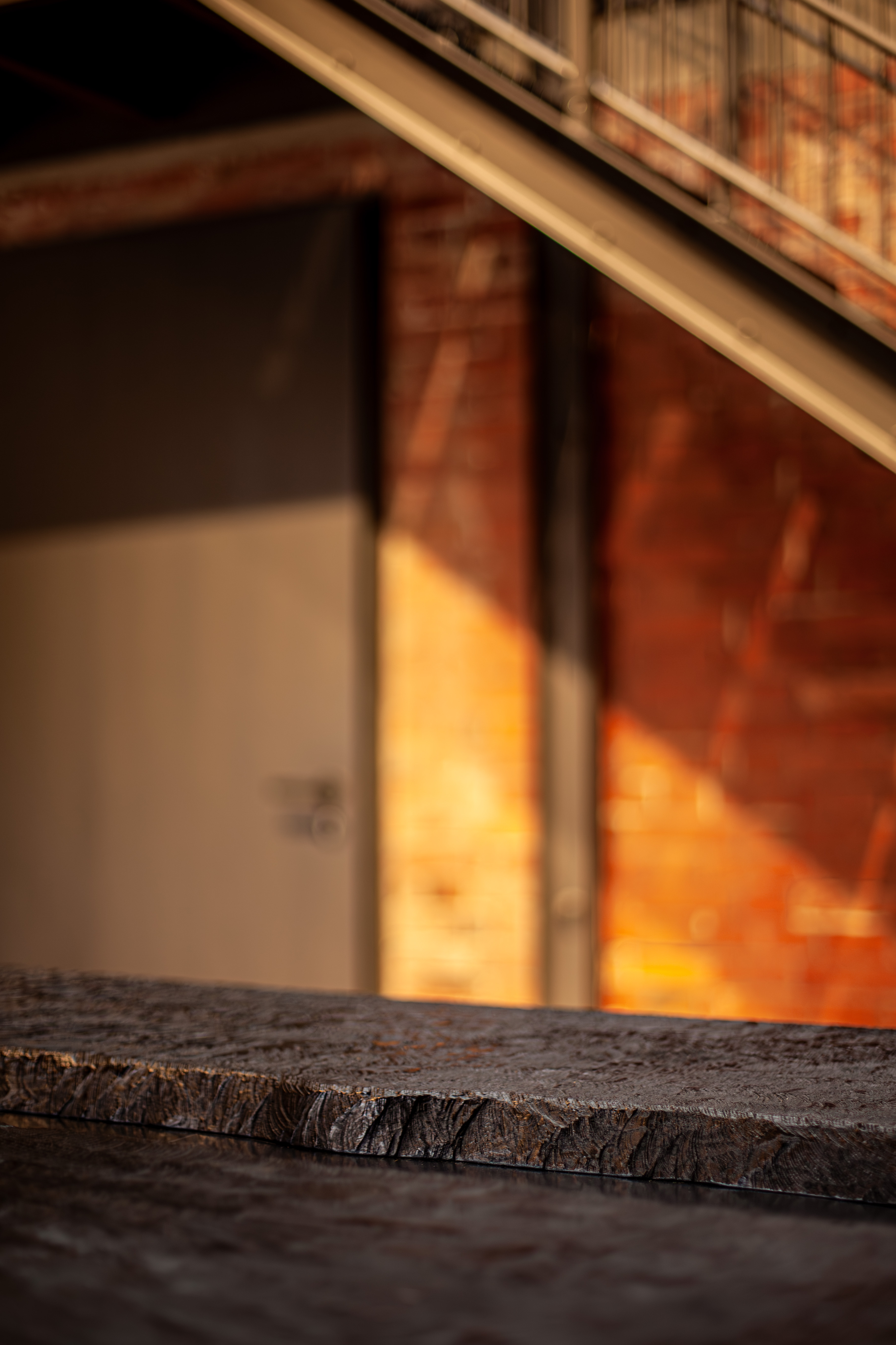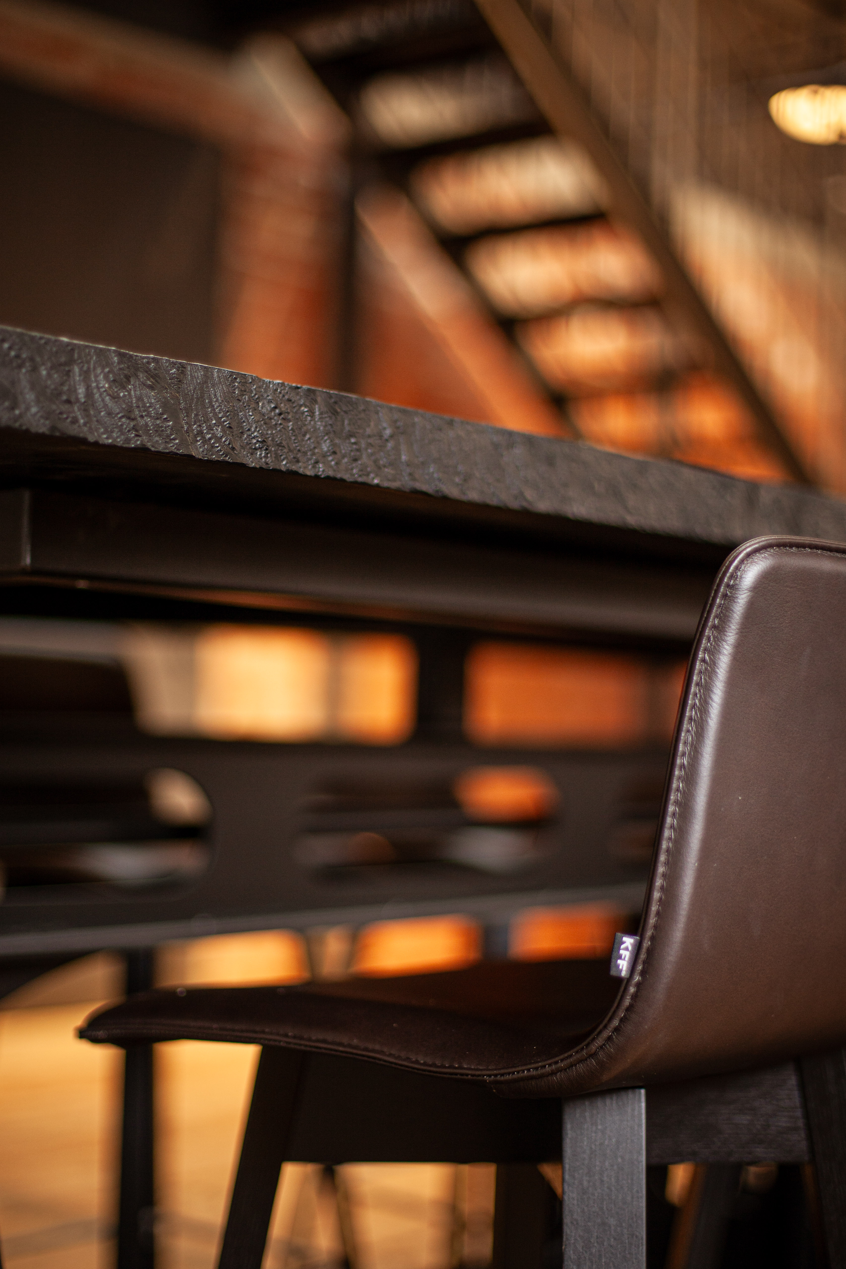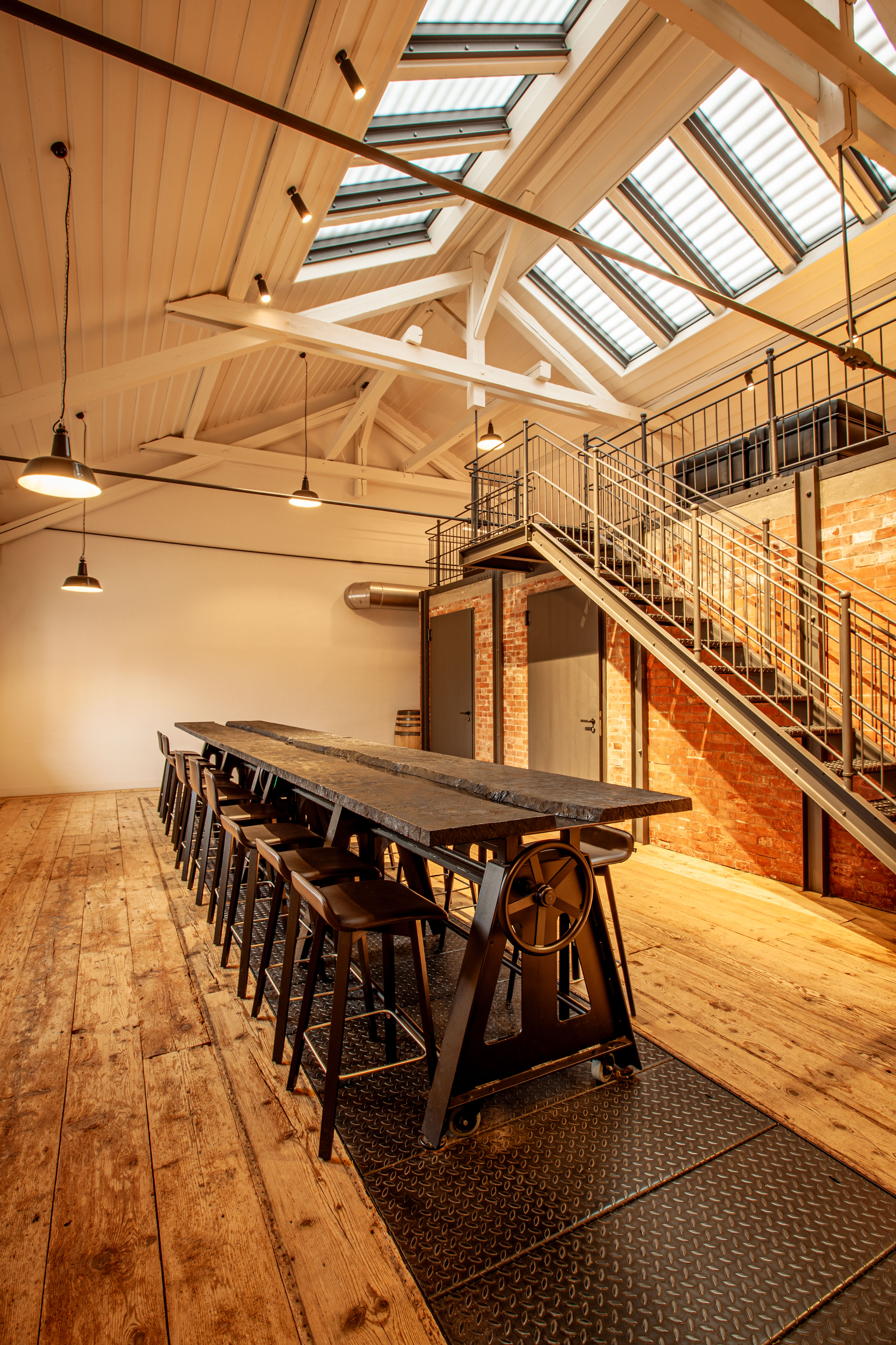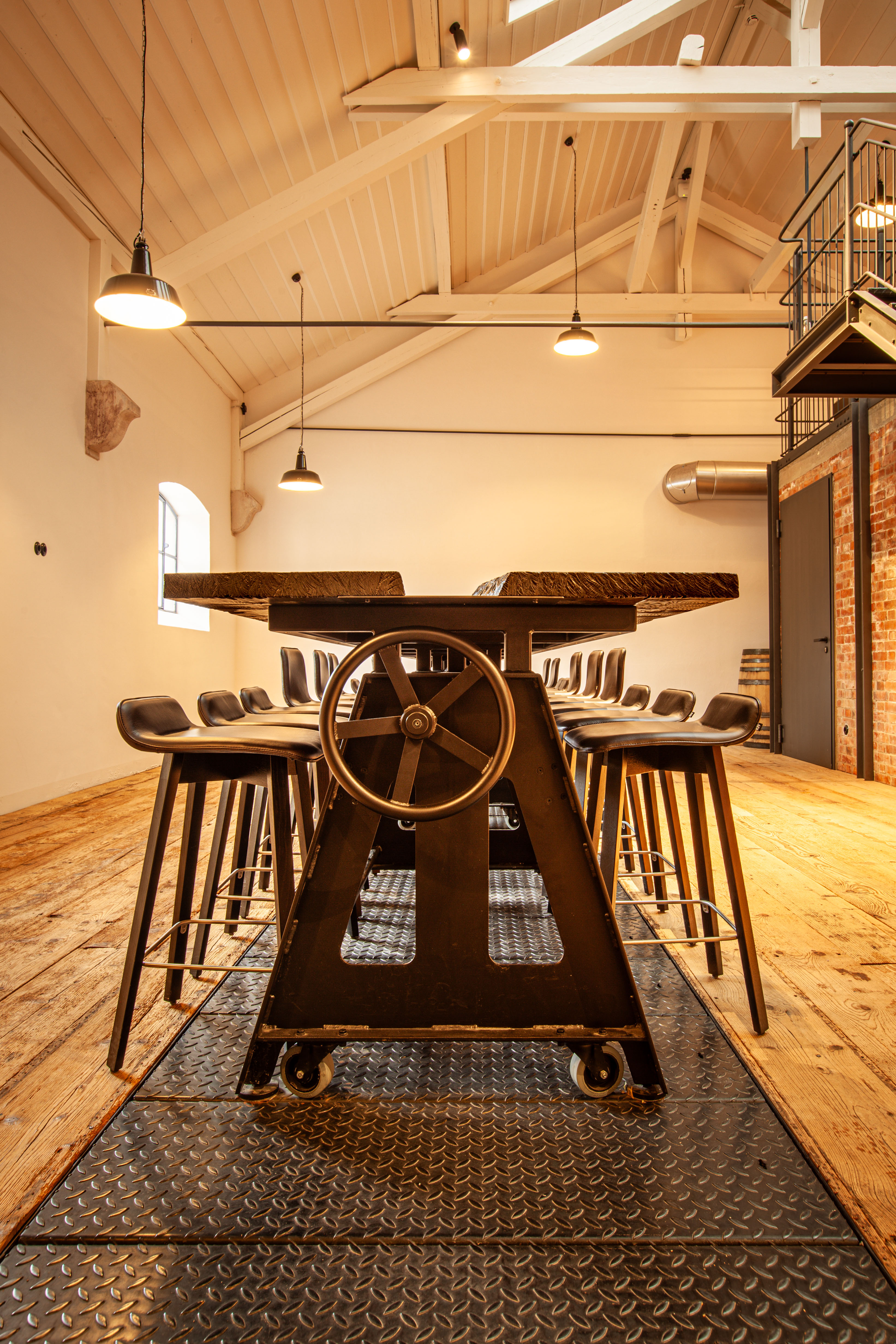 Der über 12 Meter lange Verkostungstisch ist ein Unikat aus konstruktiver Expertise und handwerklicher Leidenschaft. Veranstaltungsbedingt lässt sich der Tisch zweiteilen und anschließend über einen verdeckten Anhebemechnismus mit ausfahrbaren Rollen frei im Raum platzieren. Die massiven handgehobelten Eichenbohlen fassen mittig ein tiefliegendes patiniertes Zunderblech zur besonderen Warenpräsentation und die farblich passenden halbhohen Barhocker in Nappaleder bezeugen, Teil eines besonderen Erlebnisses zu sein.